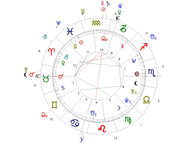 Otra señal de guerras es el Sol en la casa 7 (lugar de los enemigos) en 23º41'Tauro, en conjunción con la estrella Algol, estrella con reputación de maligna a la que se asocia con la violencia, o bien por cometerla, o bien por sufrirla. Igual que el día de los musulmanes es el viernes, o día de Venus, el día de los judíos es el Sábado Saturday, o día de Saturno. En la carta natal de Israel es normal que Saturno, regente del Fondo del Cielo (o cúspide de la casa 4) en Acuario, ocupe una posición angular en la casa 10; no obstante ese dominio es ejercido mediante violencia y ocasiona graves conflictos, al estar Saturno en 16º25'Leo en exilio y en cuadratura con el Sol (regente del Medio Cielo en Leo) en la casa 7, así maleficiado como hemos visto, y con los nodos lunares. La razón de ser del estado de Israel era servir de refugio a los perseguidos por ser judíos. Aunque los fundadores del estado fueran ateos y solo sea practicante una parte de los israelíes, el judaísmo es una religión. El regente de la casa 9 cuya cúspide está en Cáncer es la Luna situada en 4º43'Leo en conjunción exacta con el Medio Cielo en 4º10'Leo. Si acudimos a la Gematría, el valor gemátrico de JERUSALEM, la ciudad santa,que evidentemente tendrá que calcularse directamente de los caracteres hebreos יךושלים, es 596, que llevado sobre el zodiaco a partir del 0 de Aries en el sentido del reloj es 236º, equivalente a 4ºLeo, que "casualmente" coincide con el Medio Cielo y la Luna en la carta natal del estado. El valor gemátrico de SION (ציון) es 156, equivalente a 24ºLibra, en orbe de conjunción con el Ascendente aunque en la casa 12. Si los países o los pueblos tuvieran karma, igual que las personas, el karma de Israel sería bastante duro. El nodo lunar sur, que representa la herencia que arrastramos desde vidas anteriores, está en 13º41'Escorpio en la casa 1 en conjunción estrecha con la parte del Infortunio. El valor gemátrico de Ha'Shoa השואה(el Holocausto) es de 317, equivalente a 13ºTauro, en conjunción exacta con el nodo lunar norte en la casa 7. La economía de Israel es relativamente próspera por estar Júpiter presente en la casa 2 domiciliado en 27º38'Sagitario en buen aspecto con Marte (regente de la cúspide de la casa 2 en 29º50'Escorpio) en la casa 10, aunque retrógrado, pero condicionada por el boicot que sufre por parte de los estados árabes y musulmanes, señalado por la oposición que sufre Júpiter en la casa 2 desde Venus en la casa 9 en 4º48'Cáncer y Urano en la casa 8 en 24º21'Géminis. Ya hemos empezado a nombrar a los planetas descubiertos en época moderna. Plutón en la casa 10 indica los poderosos intereses corporativos a nivel mundial que protegen al pequeño estado de sus enemigos. El ciclo de Saturno y Plutón de 32-36 años señala como ya hemos dicho en este blog los grandes cambios geopolíticos, y tiene mucho que ver con la historia de Israel. Saturno y Plutón estaban en conjunción en 1914 en Cáncer cuando comenzó la I Guerra Mundial y en 1946-1947 en Leo cuando, acabada la II Guerra Mundial, las nuevas grandes potencias se reparten el mundo, comienza la guerra fría y es creado el estado de Israel. Neptuno en la casa 12 en cuadratura con Venus, pero en sextil con la Luna, Saturno y Plutón en la casa 10, señala inequívocamente a los servicios secretos del estado, vitales para garantizar su supervivencia y famosos por su eficiencia.