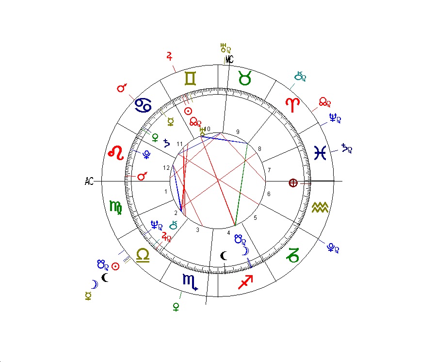 El Neptuno y la parte del Infortunio dirigidas se sitúan sobre el eje formado por los nodos lunares, la Luna, el Sol natales y el Urano natales, lo que sería otra señal aciaga.